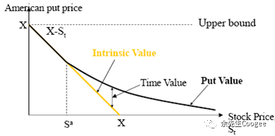 因此,无红利支付情形下,美式看跌期权在标的价格很低时,极有可能被提前执行。从而,美式看跌期权的价值不会低于内在价值(欧式看跌期权价值有可能低于内在价值)。
