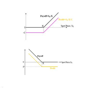 (图片来源于我的课堂讲稿。上图表示看涨期权的收益图,下图为看跌期权的收益图)