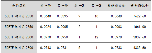 买入开仓1张“50ETF沽4月2200”,卖出开仓1张“50ETF购4月2200”,则此时合成的低行权价50ETF远期空头为:28193.88元([(0.6186-0.0005)* (1+ 0.05*15/360)+2.2] *10000);