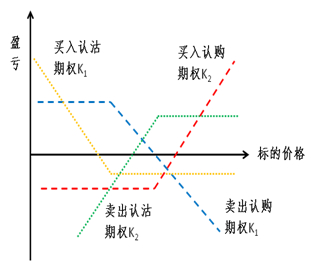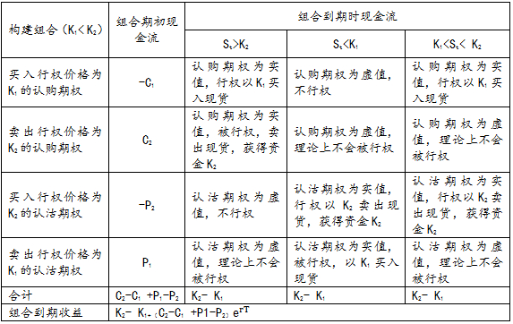 如果低行权价配对期权所隐含的无套利远期价格低于高行权价的配对期权所隐含的无套利远期价格,可“买入开仓低行权价的认购期权”+“卖出开仓低行权价的认沽期权”合成现货标的的远期多头,“卖出开仓高行权价的认购期权”+“买入开仓高行权价的认沽期权”合成现货标的的远期空头,即由认购期权牛市价差组合和认沽期权熊市价差组合构成。