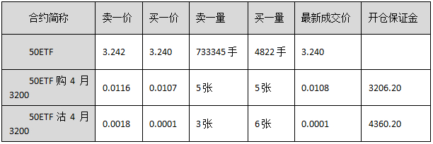小明以买一价 3.240 元融券卖空 10000 份50ETF,交纳融券保证金 29160.00(32400.00*0.75*1.20)元(保守计算,假设融券卖空所得的钱不投资于其他流动性产品);以卖一价0.0116 元买入开仓 1 张“50ETF购4月3200”,共花费权利金 116.00 元和手续费 10.00 元;以买一价 0.0001元卖出开仓1张“50ETF沽4月3200”,收入权利金 1.00 元,并交纳开仓保证金5232.24(1.20*4360.20)元。则小明构造该反向平价套利组合时,共花费34517.24 元(-29160.00-5232.24-116.00-10.00+1.00)。