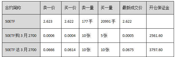 投资者小李以卖一价 2.623元买入 10000 份50ETF,花费26256.23(26230.00+26.23,现货手续费1‰)元;以买一价 0.0004 元保证金卖出开仓 1 张“50ETF 购3 月2700”,收入权利金4.00元,并交纳保证金3073.92(1.20*2561.60,投资者保证金收取标准在所司基础上上浮20%)元;以卖一价0.0666 元买入开仓 1 张“50ETF 沽3月2700”,花费权利金 666.00元和交易手续费10.00元。则小李在构造该正向平价套利组合时,共花费30002.15(26256.23+3073.92-4.00+666.00+10.00)元。