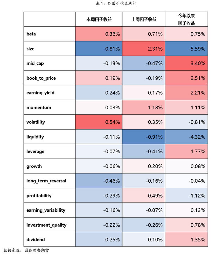 本周市场二级风格因子中,市值因子和长期反转因子回落,beta因子有所回升。因子拥挤度方面大部分因子回到非拥挤区间,目前仅市值因子、波动率、beta因子仍在低位可继续关注,本周各风格因子收益如表所示。