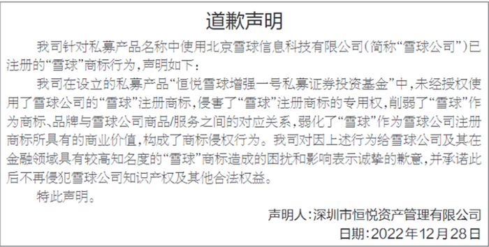 恒悦资产在道歉声明中表示,其在基金产品名称(“恒悦雪球增强一号私募证券投资基金”)中未经授权使用雪球公司的“雪球”注册商标的行为,侵害了“雪球”注册商标的专用权,削弱了“雪球”作为商标、品牌与雪球公司商品/服务之间的对应关系,弱化了“雪球”作为雪球公司注册商标所具有的商业价值,构成了商标侵权行为。