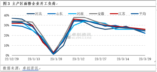 2022年12月份以来,厂家面粉订单量少,副产品客户采购也不积极,厂家走货偏慢,面粉及副产品价格同步走低,厂家由盈利逐步变为亏本经营,生产热情低迷。部分厂家阶段停机销售库存,部分厂家减少日度生产时长,开工负荷低于往年同期。卓创资讯监测数据显示,2022年12月至2023年3月主产区中小企业平均开工负荷为27.4%,同比降低3.7个百分点。