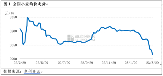 【导语】2022年12月小麦价格开启下跌通道,2023年3月下跌速度加快,创近一年价格新低。基层小麦货源余量多于往年同期,进口趋势稳中向好,终端制粉需求持续偏弱,卓创资讯预计,4月小麦市场供强需弱态势难改,行情回涨难度较大。