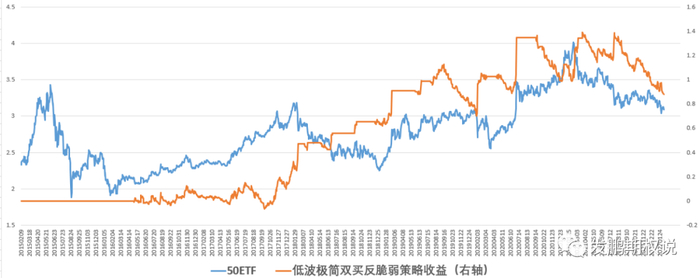 50期权上市截至2022年2月14日,策略累计获得了88 %收益,最大回撤不小, 2019年底和2021年7月至今这轮回撤都在30%+,回撤的核心原因是低波区继续降波以及时间消耗(对比下图的隐波走势可以得出)。