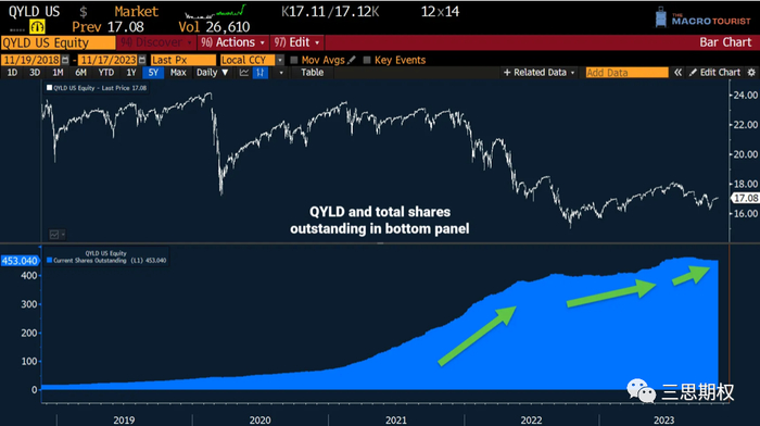 我们知道,QYLD基金做空纳指100ETF,对手方是做市商。做市商买入看涨期权,并做空期货对冲风险。
