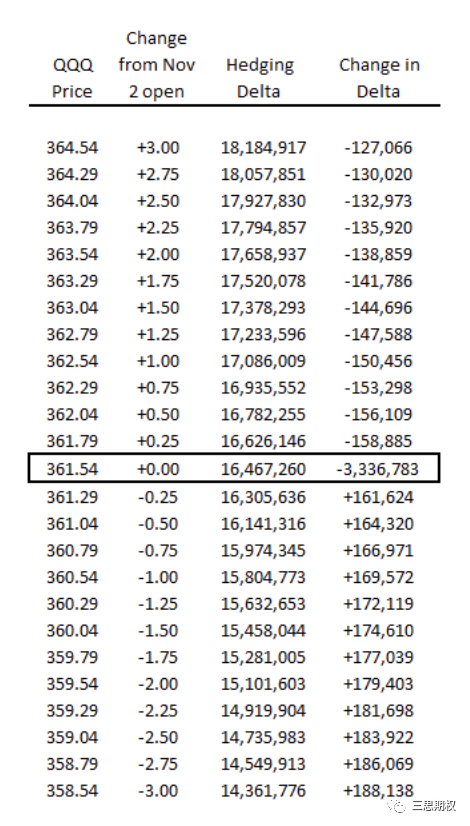第二天QQQ上涨1.3%,从356.96到361.54。假设11月2号开盘的缺口是瞬间发生的, QQQ上涨到361.54后,做市商需要做空1,650万手QQQ来对冲,就是说要再卖出340万手,共12.5亿美金。