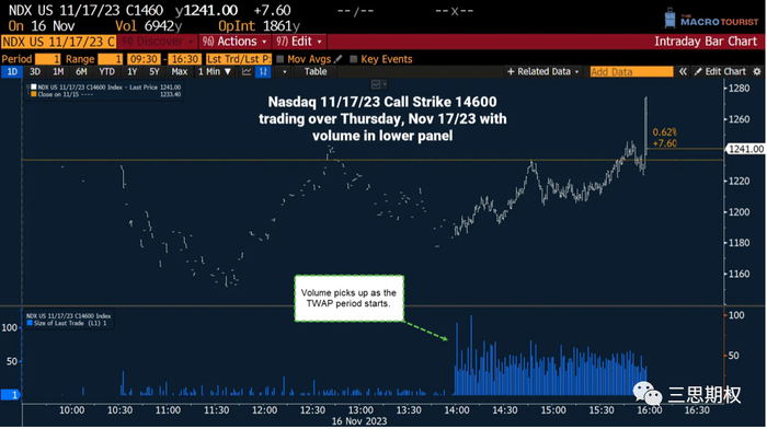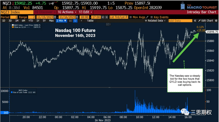 所以,即便市场参与者对此有预期,但QYLD等ETF的操作还是让纳指100一路涨到了收盘。即,备兑型ETF平仓期权空头,让美股价格上行(下图)。