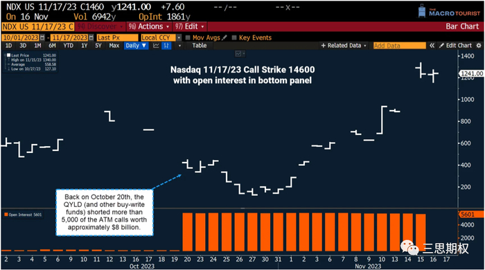 像是上个月,QYLD做空了约5,600张11月17日到期的纳指100看涨期权,行权价为14,600。这些仓位是在10月20日买入的,当时的收盘价在14,560(下图)。