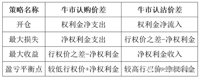 从到期收益看,牛市认购价差和牛市认沽价差的收益都在标的价格超过高行权价的时候达到最大,但认购价差的最大收益等于两个行权价之间的差额减去净权利金支出,认沽价差的最大收益则是净权利金收入。具体的分析可见下表: