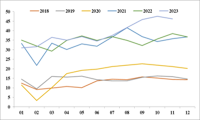 2023年,国产50%铅精矿加工费月度TC持稳在800-1400元/金属吨之间波动。进口60%铅精矿月度加工费TC在40-80美元/干吨之间波动。进口方面,进口窗口多数时间关闭,影响了国内对于进口矿的采购,总体以采购国产矿为主。