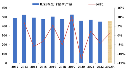 2019年以来全球矿山铅产量整体处于下行周期,ILZSG预计 2023 年全球铅精矿产量增长 3.3%(约465万吨),其中中国增 1.3%,中国以外的地区增 4.9%,2024 年则全球铅精矿产量增长 2.9%,中国增长 1.5%,中国以外的地区增长 3.9%。