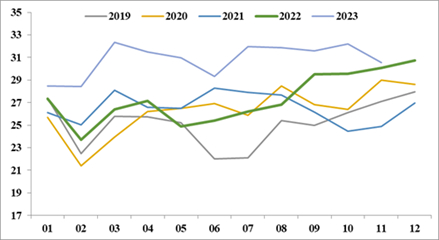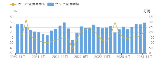 2023年1—11月我国汽车产销累计完成2711.1万辆和2693.8万辆,同比分别增长10%和10.8%。其中,新能源汽车产销累计完成842.6万辆和830.4万辆,同比分别增长34.5%和36.7%,市场占有率为30.8%。2024年预计汽车增速会有所放缓。新能源汽车则可能自超高速继续降速回归。