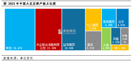 中国大豆压榨产业进入高质量发展阶段。具体表现在:集中化压榨区域的不断强化,企业规模化水平不断提升,行业集中度不断提升,投资结构不断优化。卓创资讯统计数据显示,2023年区域产能结构较为稳定,排名前三位的仍然是华南、华东及山东区域,全国占比分别为 26.06%、21.35%、17.93%。2023 年华南、华东及西南区域产能有所增加,其他区域产能较去年保持稳定。同时,2023 年中国大豆压榨企业 CR10 企业产能集中度为 73.58%,保持在较高水平。