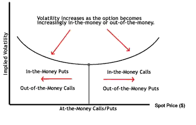 而波动率微笑(volatility smile) 表示波动率在保持到期日不变的情况下随执行价格变化情况,进一步解释是虚值期权(out of money) 和实值期权(in the money)的波动率高于平值期权(at the money)的波动率,形成一条中间低两边高的向上半月形,形状像“微笑”。波动率微笑多出现在外汇期权市场。