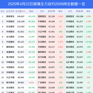 新浪期货 根据交易所数据,截至4月22日收盘主力合约玻璃2509,涨跌-0.18%,成交量98.62万手,持仓数据显示前20席位呈现净空,差额头寸为127868手。