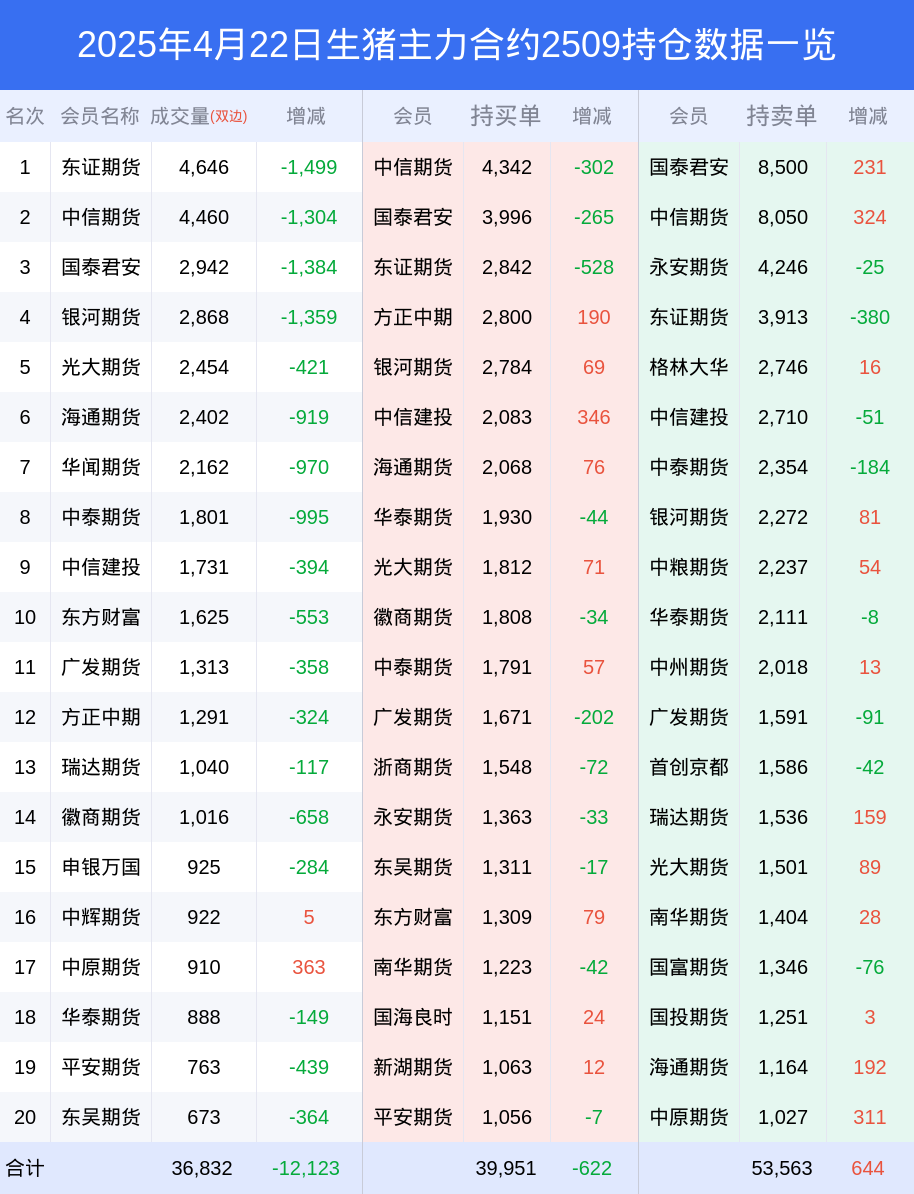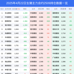 新浪期货 根据交易所数据,截至4月22日收盘主力合约生猪2509,涨跌-0.03%,成交量2.91万手,持仓数据显示前20席位呈现净空,差额头寸为13612手。