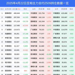 新浪期货 根据交易所数据,截至4月22日收盘主力合约豆粕2509,涨跌+0.36%,成交量158.32万手,持仓数据显示前20席位呈现净空,差额头寸为361910手。