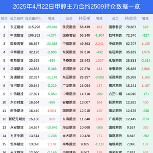 新浪期货 根据交易所数据,截至4月22日收盘主力合约甲醇2509,涨跌-0.53%,成交量48.74万手,持仓数据显示前20席位呈现净空,差额头寸为36181手。