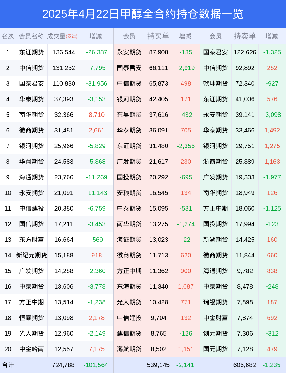 根据合并数据显示,多头前三席位为永安期货(代客),总持仓87908、国泰君安(代客),总持仓66111、中信期货(代客),总持仓65873;空头前三席位为国泰君安(代客),总持仓122626、中信期货(代客),总持仓92892、乾坤期货(代客),总持仓72340;