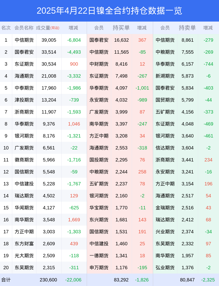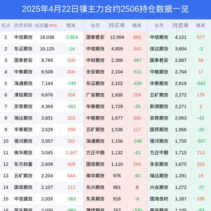 新浪期货 根据交易所数据,截至4月22日收盘主力合约镍2506,涨跌+0.02%,成交量7.00万手,持仓数据显示前20席位呈现净多,差额头寸为1836手。