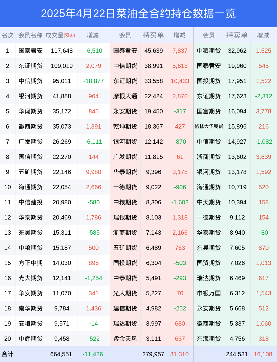 菜油期货全合约总计成交51.31万手,比上一日减少1.53万手。全合约前20席位多头持仓29.99万手,比上一日增加3.15万手。全合约前20席位空头持仓26.46万手,比上一日增加1.78万手。