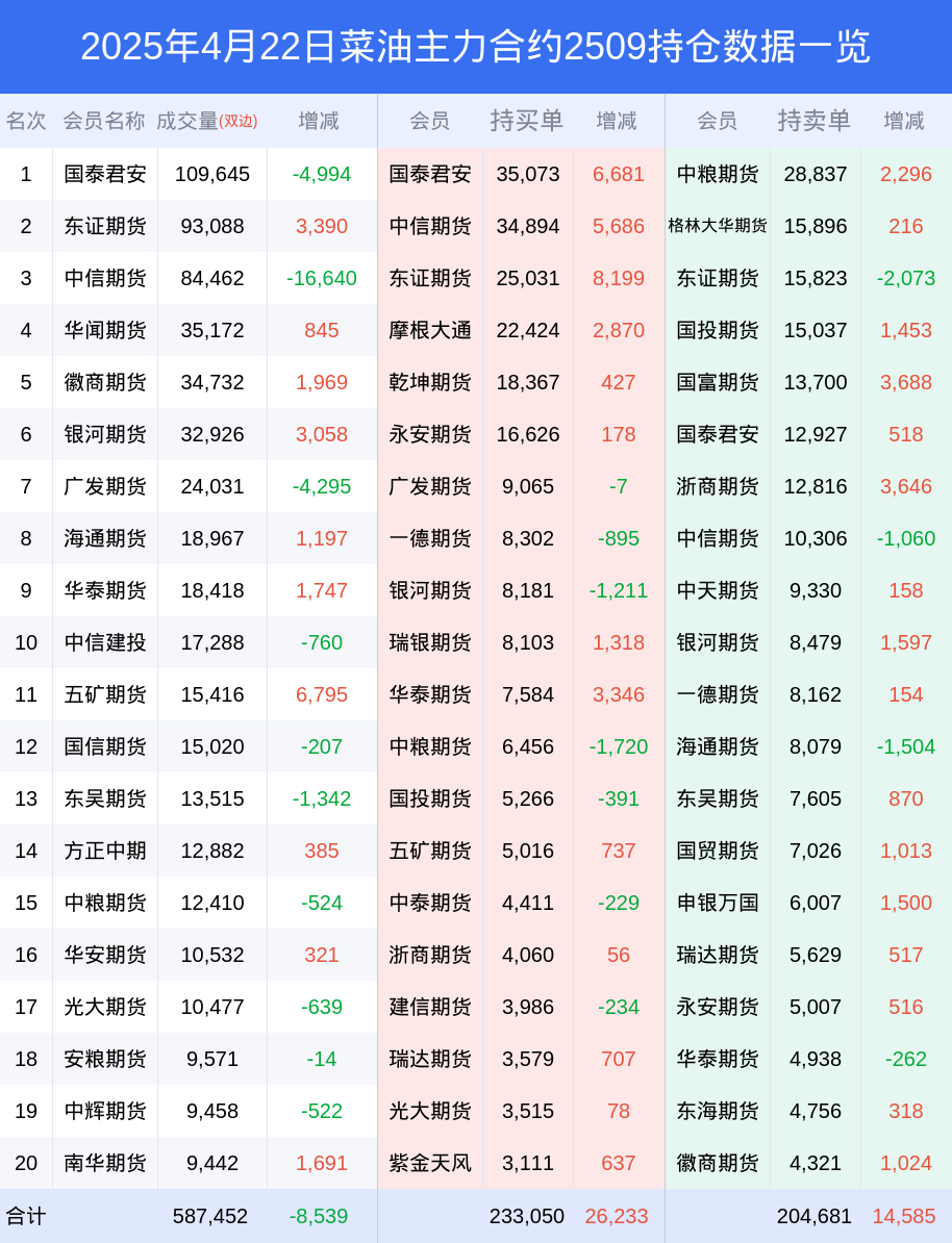新浪期货 根据交易所数据,截至4月22日收盘主力合约菜油2509,涨跌+1.27%,成交量45.31万手,持仓数据显示前20席位呈现净多,差额头寸为28369手。