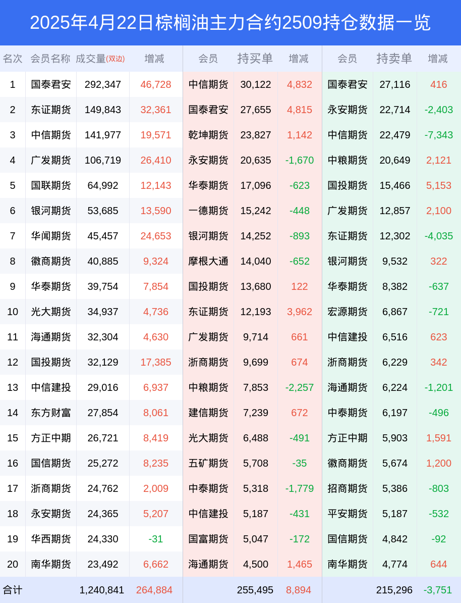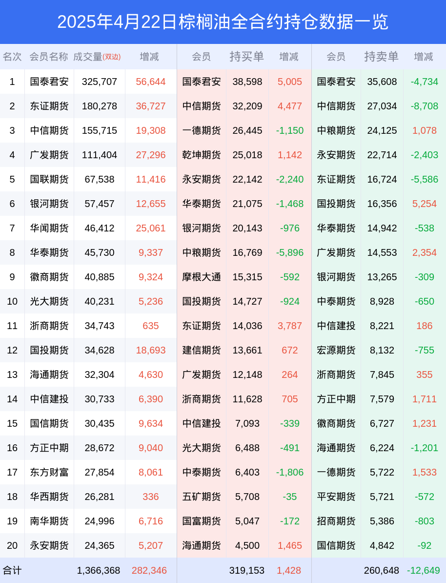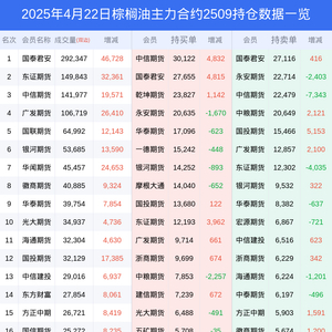 新浪期货 根据交易所数据,截至4月22日收盘主力合约棕榈油2509,涨跌+0.67%,成交量93.65万手,持仓数据显示前20席位呈现净多,差额头寸为40199手。