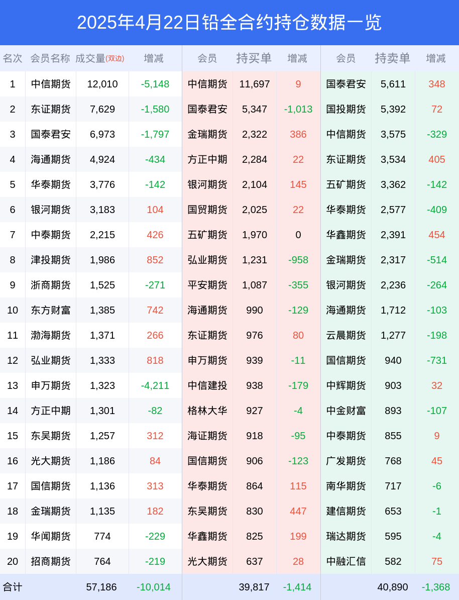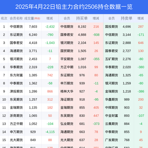 新浪期货 根据交易所数据,截至4月22日收盘主力合约铅2506,涨跌+0.06%,成交量2.85万手,持仓数据显示前20席位呈现净空,差额头寸为367手。