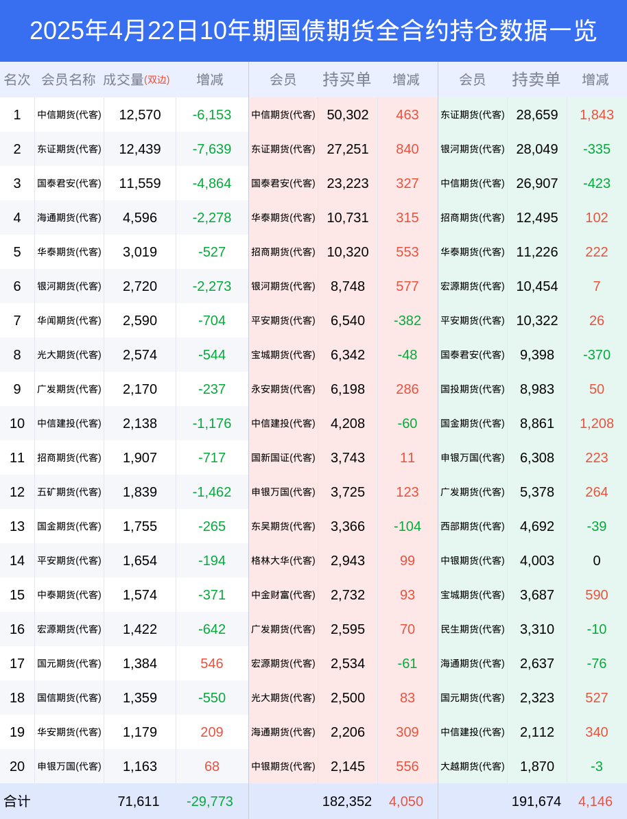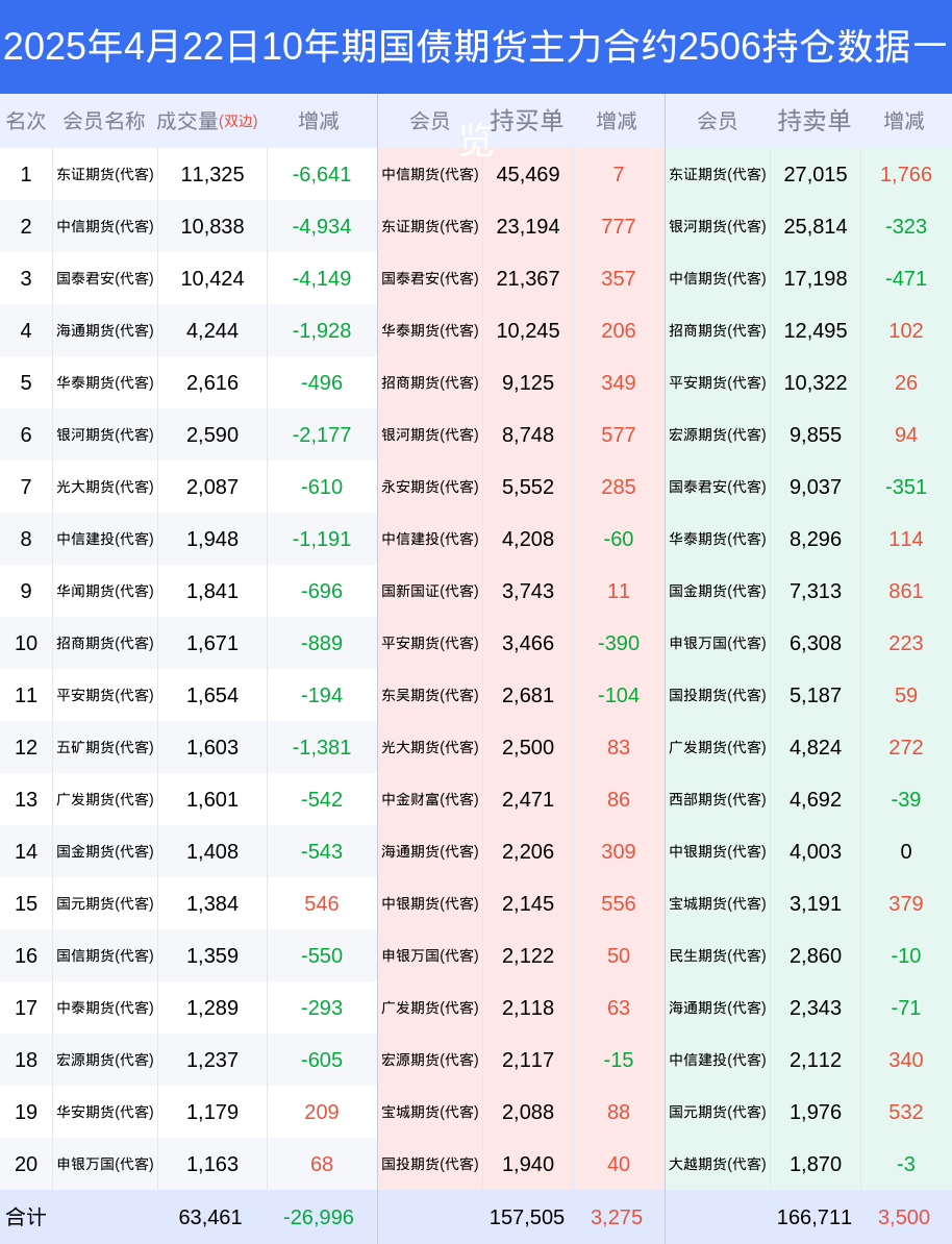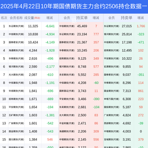 新浪期货 根据交易所数据,截至4月22日收盘主力合约10年期国债期货2506,涨跌+0.17%,成交量4.16万手,持仓数据显示前20席位呈现净空,差额头寸为9206手。