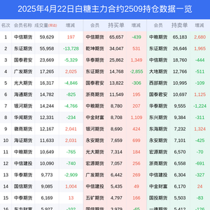 新浪期货 根据交易所数据,截至4月22日收盘主力合约白糖2509,涨跌-0.20%,成交量24.33万手,持仓数据显示前20席位呈现净多,差额头寸为15112手。