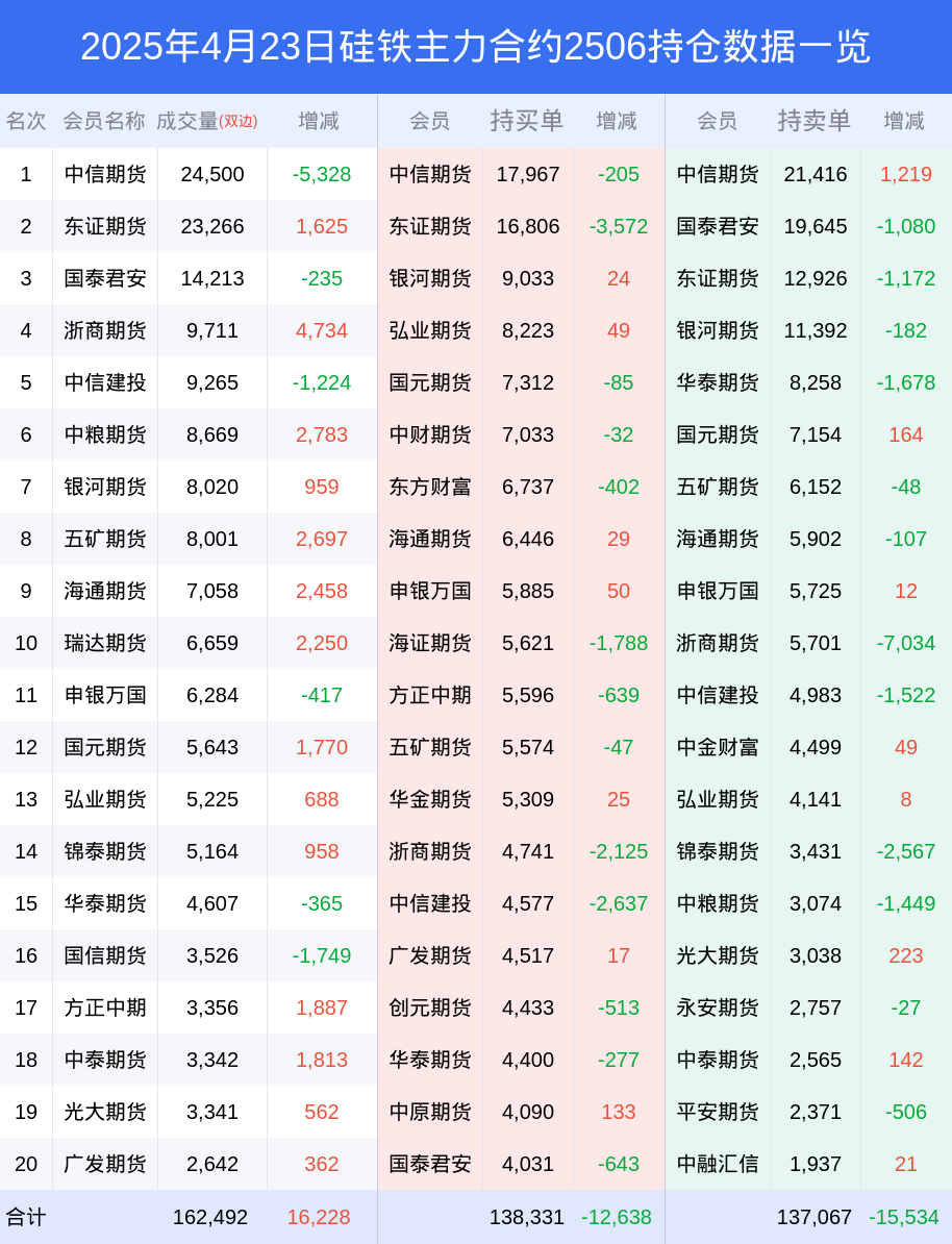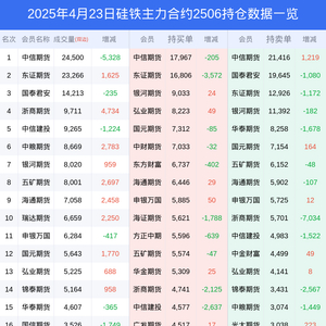 新浪期货 根据交易所数据,截至4月23日收盘主力合约硅铁2506,涨跌+0.32%,成交量10.50万手,持仓数据显示前20席位呈现净多,差额头寸为1264手。