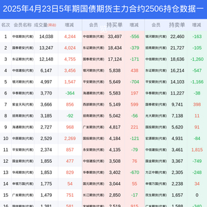 新浪期货 根据交易所数据,截至4月23日收盘主力合约5年期国债期货2506,涨跌-0.13%,成交量4.93万手,持仓数据显示前20席位呈现净空,差额头寸为18658手。