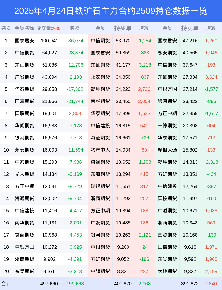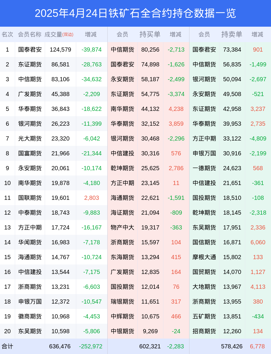 铁矿石期货全合约总计成交49.03万手,比上一日减少23.57万手。全合约前20席位多头持仓66.76万手,比上一日减少2193手。全合约前20席位空头持仓65.76万手,比上一日增加6606手。
