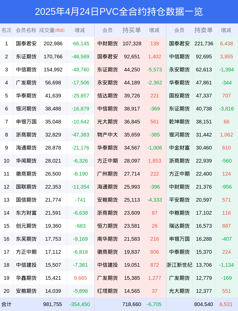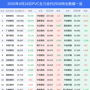 新浪期货 根据交易所数据,截至4月24日收盘主力合约PVC2509,涨跌-0.24%,成交量62.95万手,持仓数据显示前20席位呈现净空,差额头寸为35574手。