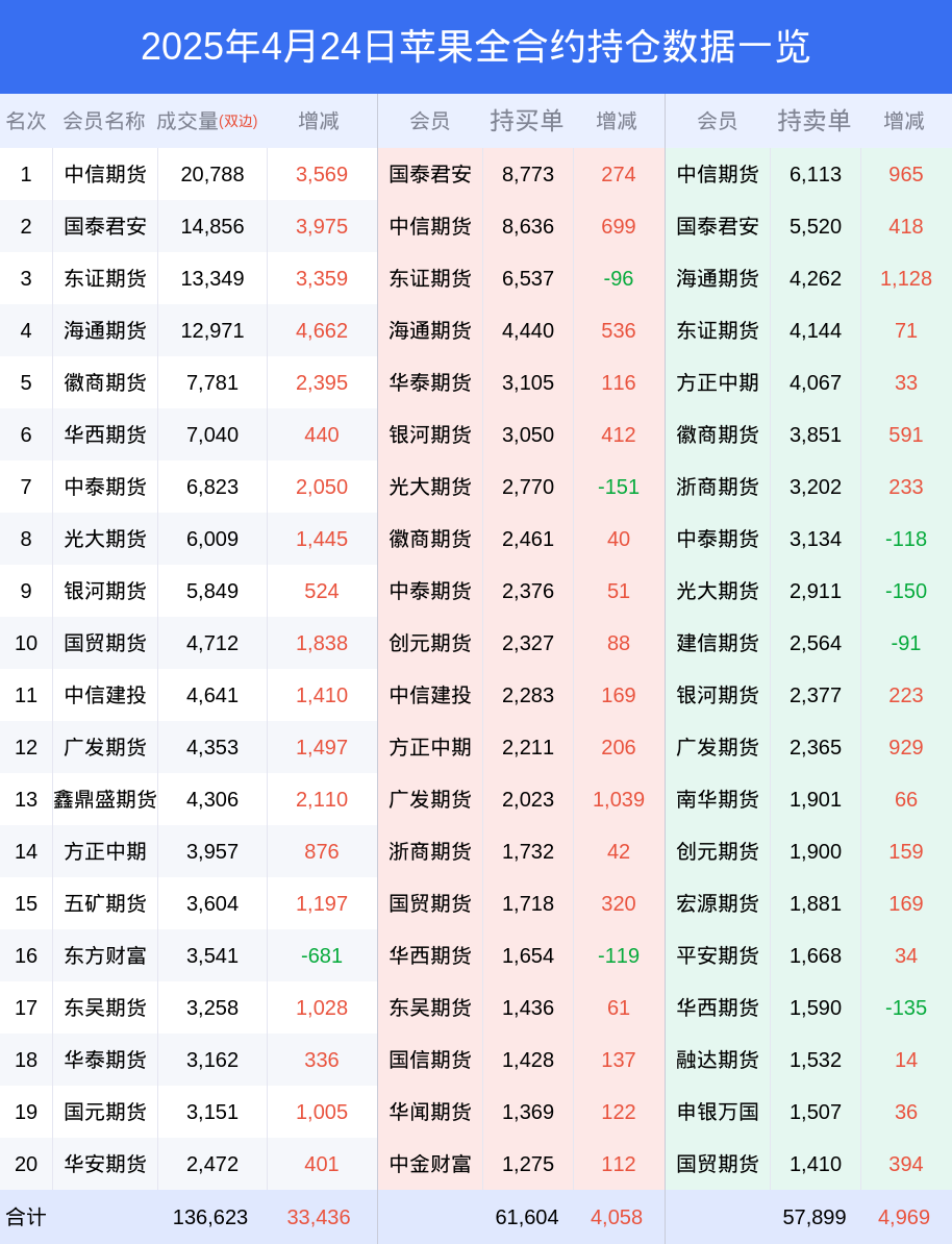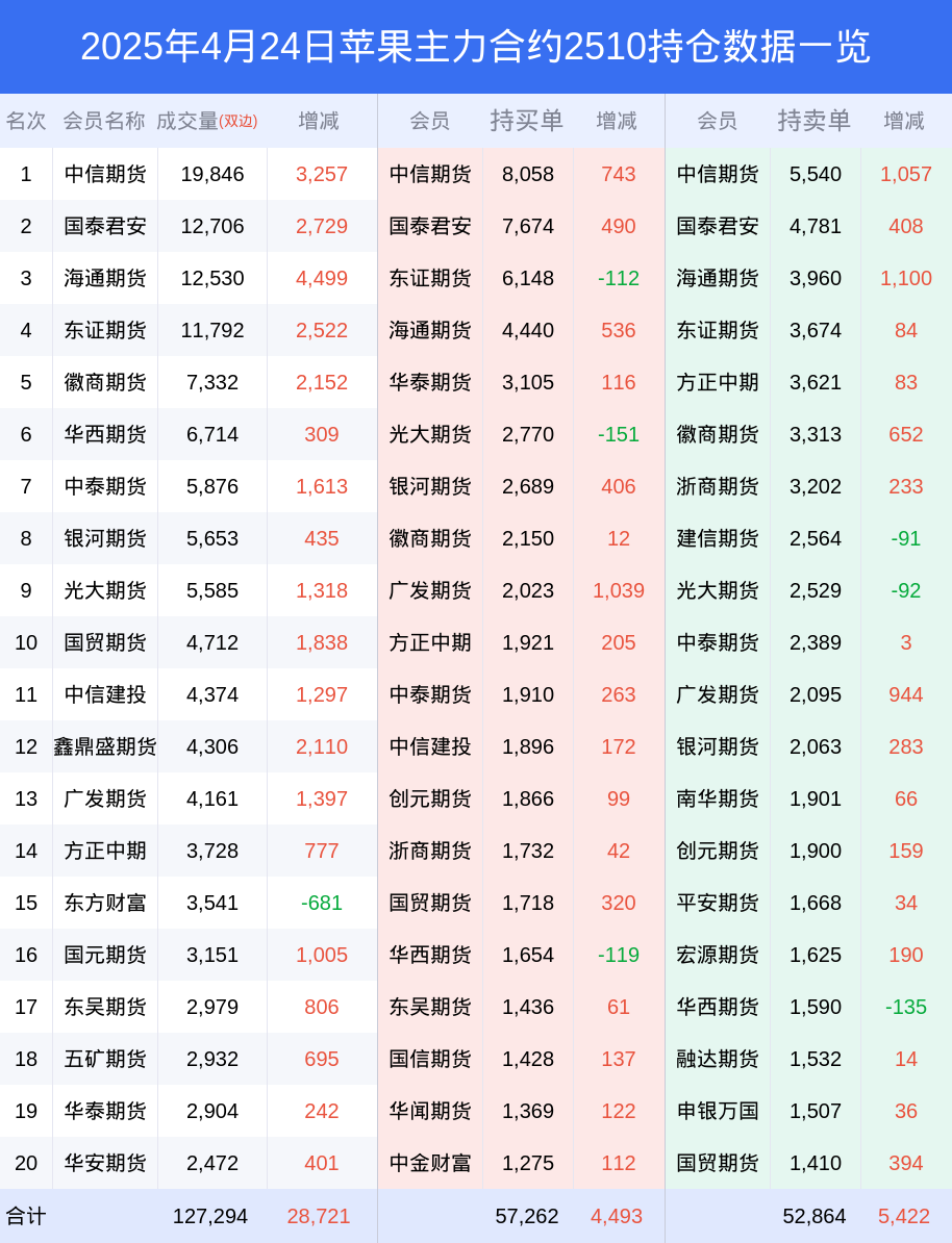 新浪期货 根据交易所数据,截至4月24日收盘主力合约苹果2510,涨跌+0.70%,成交量11.21万手,持仓数据显示前20席位呈现净多,差额头寸为4398手。