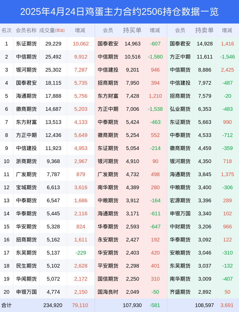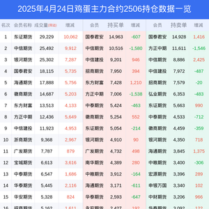 新浪期货 根据交易所数据,截至4月24日收盘主力合约鸡蛋2506,涨跌-1.39%,成交量18.88万手,持仓数据显示前20席位呈现净空,差额头寸为667手。