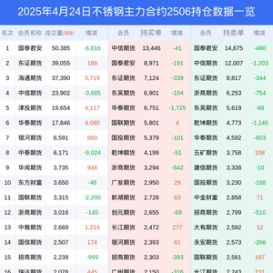 新浪期货 根据交易所数据,截至4月24日收盘主力合约不锈钢2506,涨跌+0.12%,成交量13.95万手,持仓数据显示前20席位呈现净空,差额头寸为4168手。