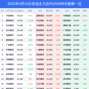 新浪期货 根据交易所数据,截至4月24日收盘主力合约豆油2509,涨跌+0.59%,成交量33.96万手,持仓数据显示前20席位呈现净空,差额头寸为53036手。