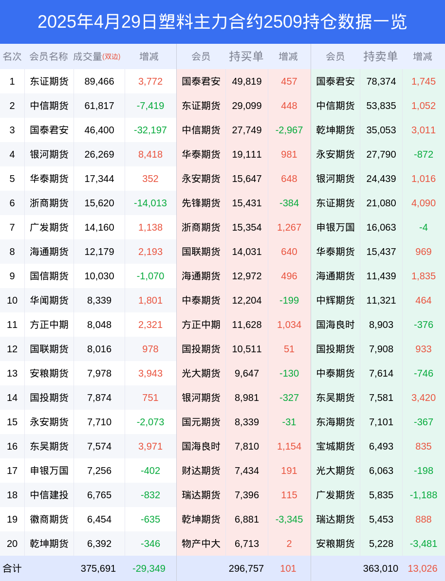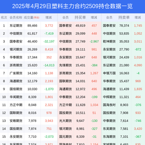 新浪期货 根据交易所数据,截至4月29日收盘主力合约塑料2509,涨跌-0.60%,成交量26.16万手,持仓数据显示前20席位呈现净空,差额头寸为66253手。