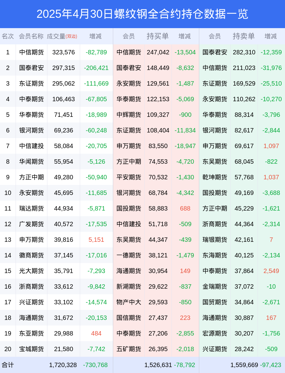 根据合并数据显示,多头前三席位为中信期货,总持仓247042、国泰君安,总持仓148449、永安期货,总持仓129561;空头前三席位为国泰君安,总持仓282310、中信期货,总持仓211023、东证期货,总持仓169529;