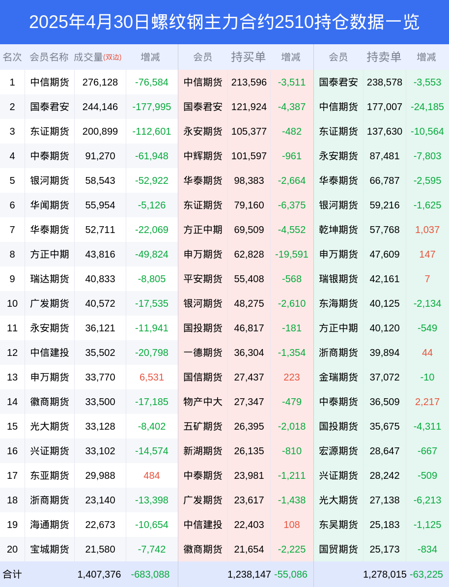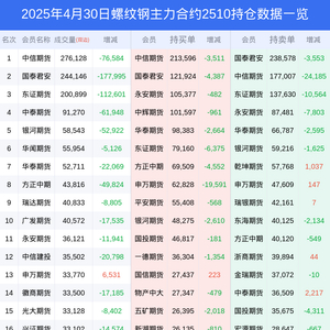 新浪期货 根据交易所数据,截至4月30日收盘主力合约螺纹钢2510,涨跌-0.42%,成交量103.47万手,持仓数据显示前20席位呈现净空,差额头寸为39868手。