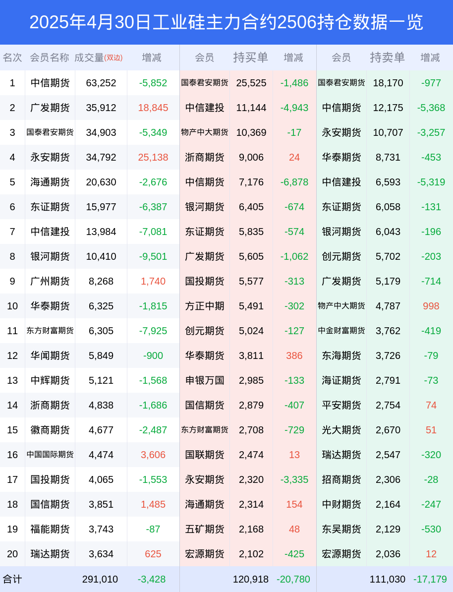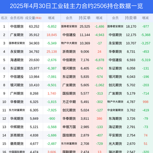 新浪期货 根据交易所数据,截至4月30日收盘主力合约工业硅2506,涨跌-1.21%,成交量18.68万手,持仓数据显示前20席位呈现净多,差额头寸为9888手。