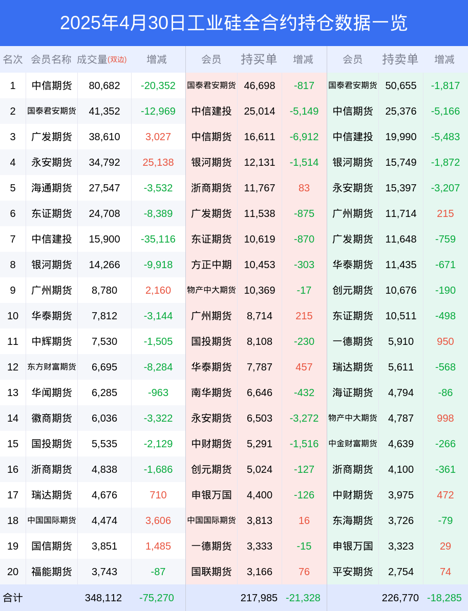 工业硅期货全合约总计成交29.25万手,比上一日减少4.22万手。全合约前20席位多头持仓24.36万手,比上一日减少2.31万手。全合约前20席位空头持仓25.11万手,比上一日减少1.90万手。