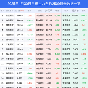 新浪期货 根据交易所数据,截至4月30日收盘主力合约白糖2509,涨跌-0.54%,成交量24.18万手,持仓数据显示前20席位呈现净多,差额头寸为6711手。