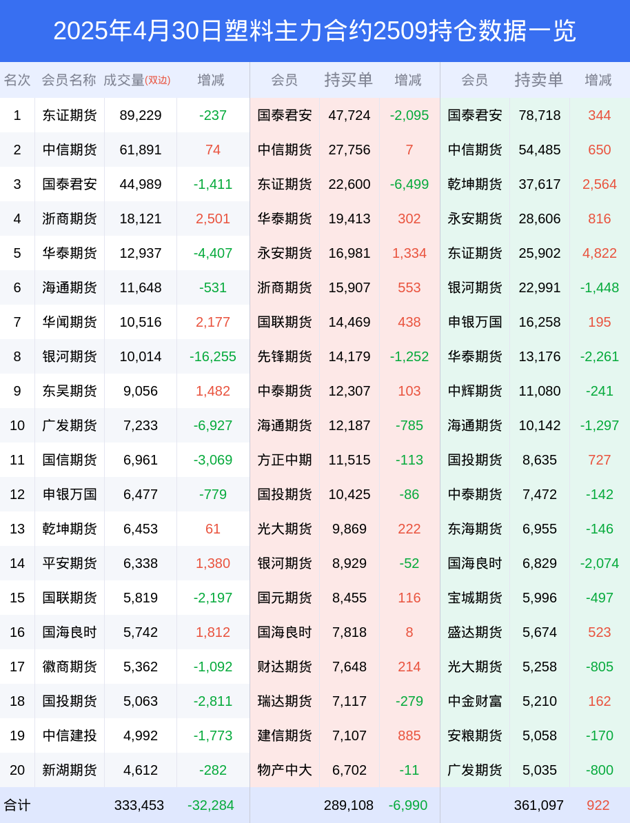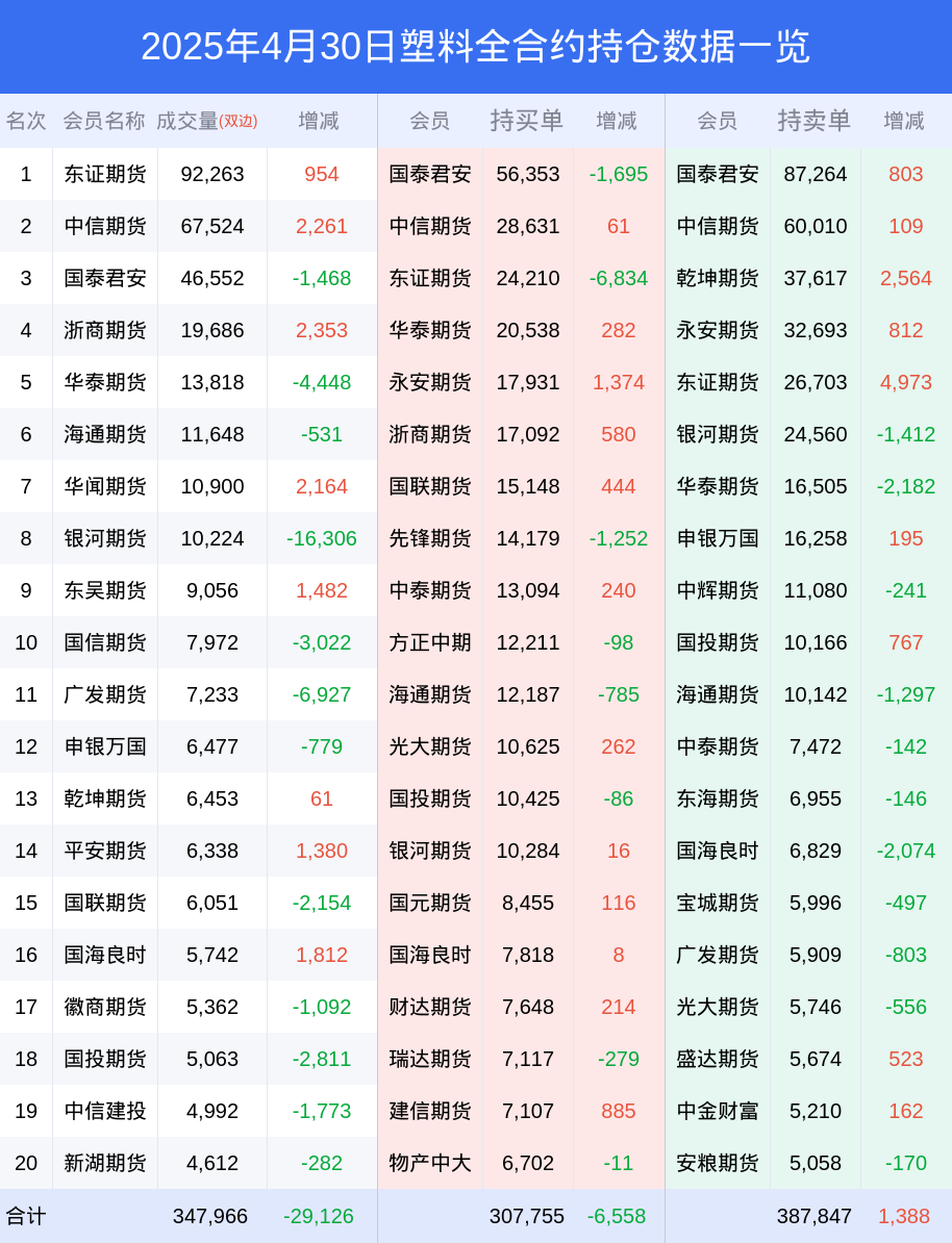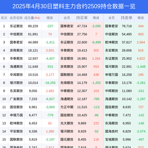 新浪期货 根据交易所数据,截至4月30日收盘主力合约塑料2509,涨跌-0.65%,成交量23.12万手,持仓数据显示前20席位呈现净空,差额头寸为71989手。
