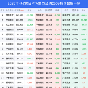新浪期货 根据交易所数据,截至4月30日收盘主力合约PTA2509,涨跌-0.27%,成交量81.32万手,持仓数据显示前20席位呈现净空,差额头寸为125944手。