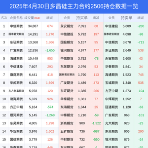 新浪期货 根据交易所数据,截至4月30日收盘主力合约多晶硅2506,涨跌-0.04%,成交量12.46万手,持仓数据显示前20席位呈现净多,差额头寸为8871手。